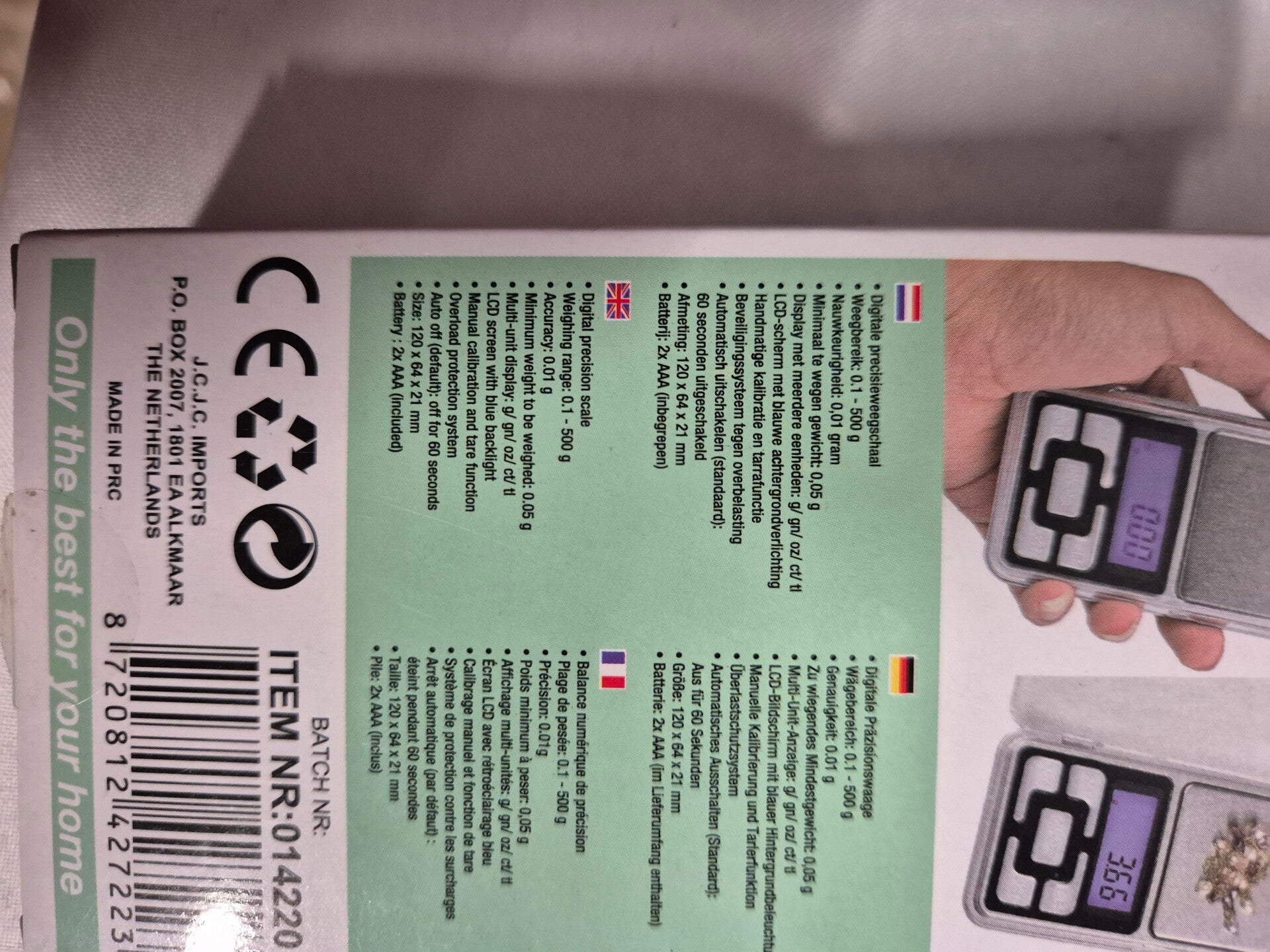 Weegschaal klein model makkelijk mee te nemen in je zak gaat van 0,1 tot 500 gram is inclusief batterijen
